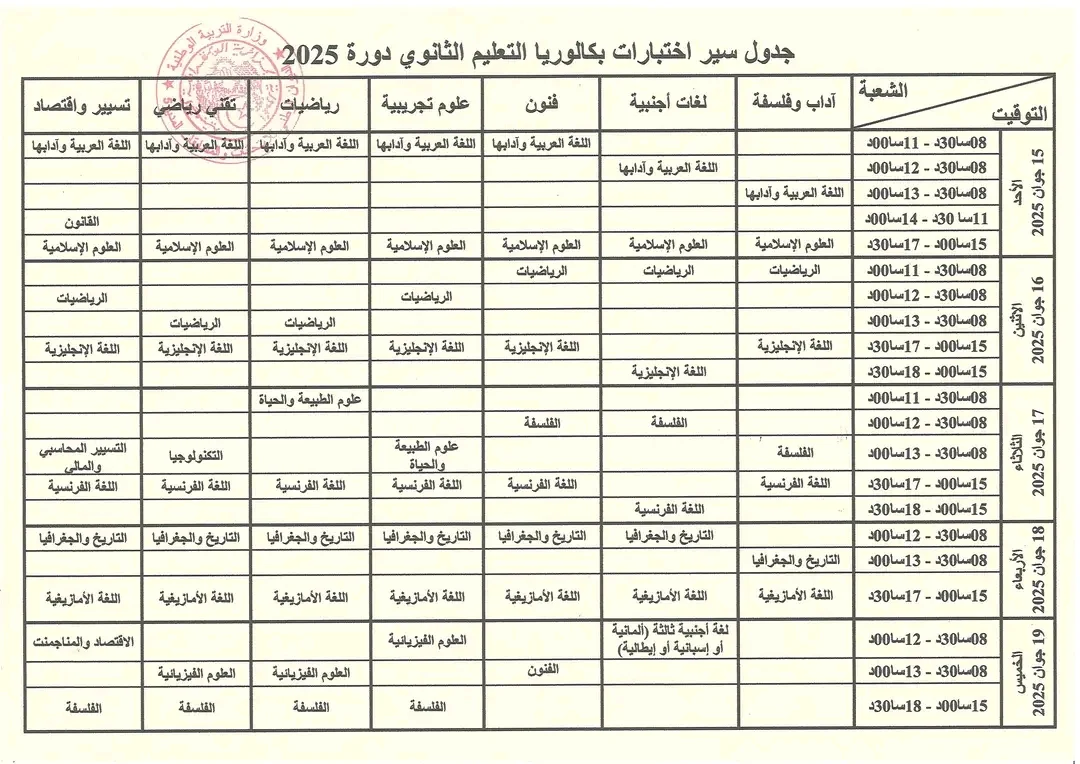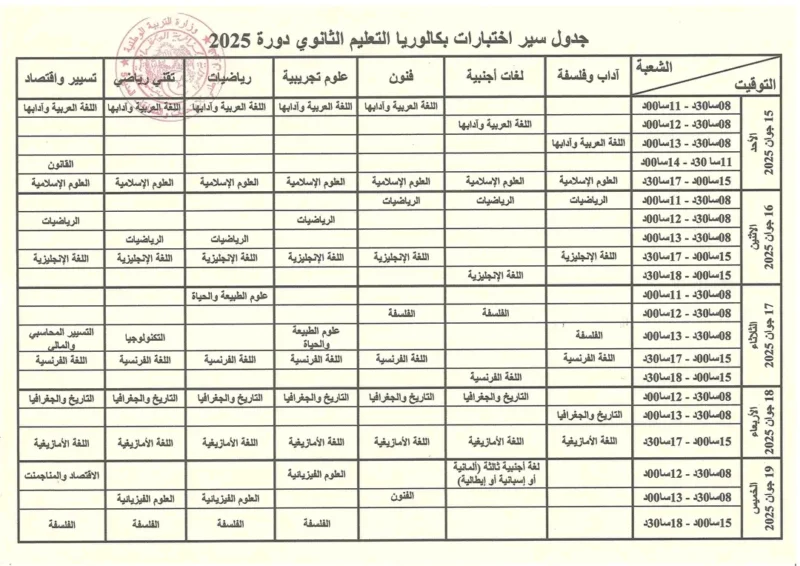 جدول سير اختبارات امتحان شهادة التعليم الثانوي بكالوريا دورة جوان 2025 لكل المترشحين المقبلين على اجتياز الامتحان لكل الشعب الأدبية و العلمية و التقنية