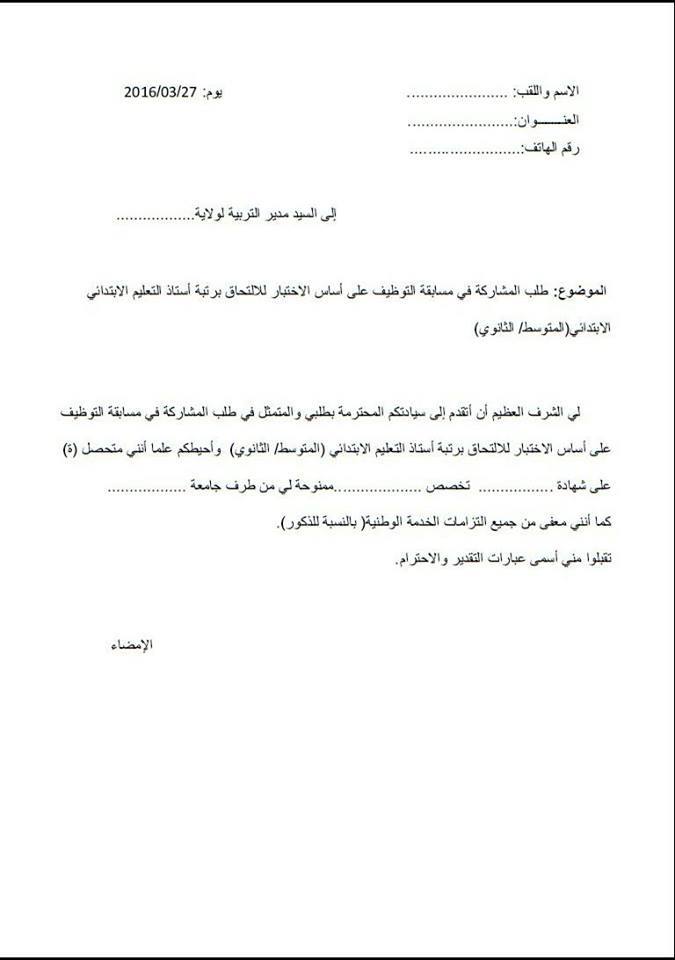 لي الشرف أن اتقدم إلى سيادتكم الموقرة بطلبي هذا قصد المشاركة في مسابقة التوظيف الخاصة بأساتذة التعليم الثانوي ( المتوسط – الابتدائي