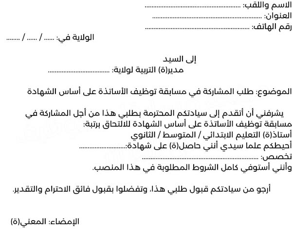 نموذج طلب خطي جاهز للتحميل للمشاركة في مسابقة توظيف الاساتذة