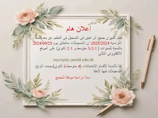 الكلمات المفتاحية: تسجيلات المراسلة 2026، موقع ONEFD، الدراسة بالمراسلة في الجزائر 2027، التسجيل الأولي بالمراسلة.