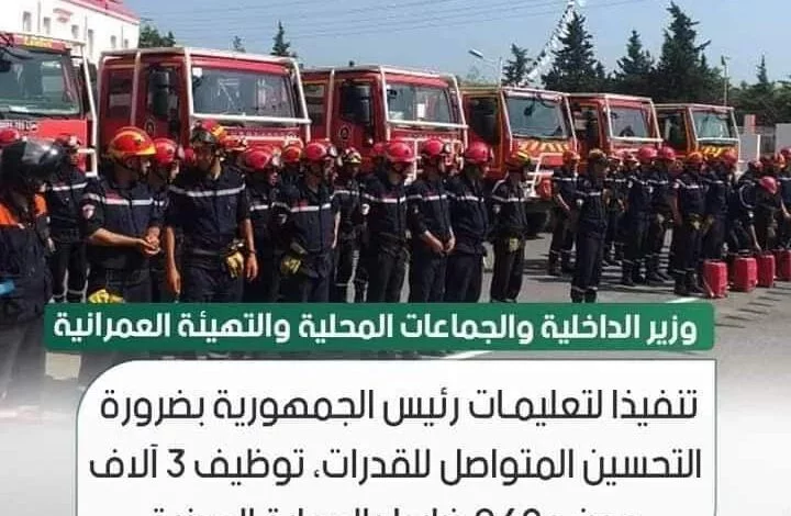 أعلنت وزارة الداخلية والجماعات المحلية والتهيئة العمرانية، وتنفيذا لتعليمات رئيس الجمهورية بضرورة فتح التوظيف لرتبة عون الحماية المدنية ( 3000 منصب ) و ضابط الحماية المدنية ( 240 منصب ).