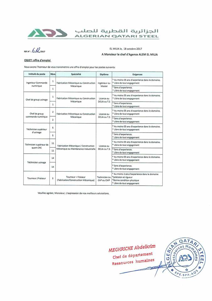 بعد ايام من التدشين الرسمي للمصنع وفي خرجة رائعة ومرموقة قامت الشركة القطرية للصلب ببلارة الميلية بفتح مجال التوظيف لشباب جيجل العاطل عن العمل والمفاجأة أنها من اصل 188 منصب ، قامت الشركة بتخصيص نصفها اي 94 منصب للشباب العديم الخبرة من خرجي الجامعات والمعاهد ، اصحاب التخصصات التقنية في الميكانيك ، الصيانة الميكانكية ، الكهرباء ، التبريد ، وغيرها ، التوظيف يتم عن طريق الوكالة المحلية للتشغيل الميلية والولائية للتشغيل .