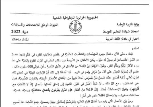 موضوع اللغة العربية شهادة التعليم المتوسط 2022 مواضيع وحلول شهادة التعليم المتوسط 2022