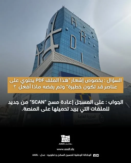 بخصوص اشعار هذا الملف يحتوى عناصر قد تكون خطيرة وتم رفضه على المسجل اعادة مسحscan جديد للملفات التي يريد تحميلها على المنصة