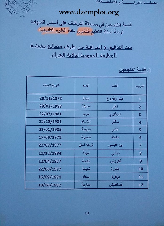 تائج مسابقة توظيف أساتذة التعليم المتوسط بمديرية التربية الجزائر غرب دورة 2015