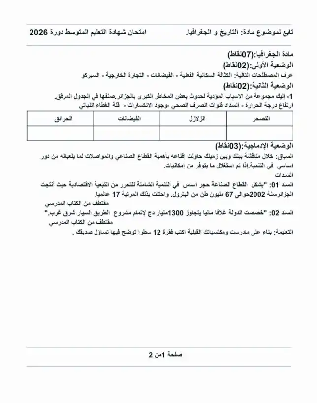 موضوع مقترح في التاريخ والجغرافيا لشهادة التعليم المتوسط دورة 2026