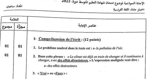 التصحيح الوزاري الرسمي لموضوع اللغة الفرنسية شهادة التعليم المتوسط 2023