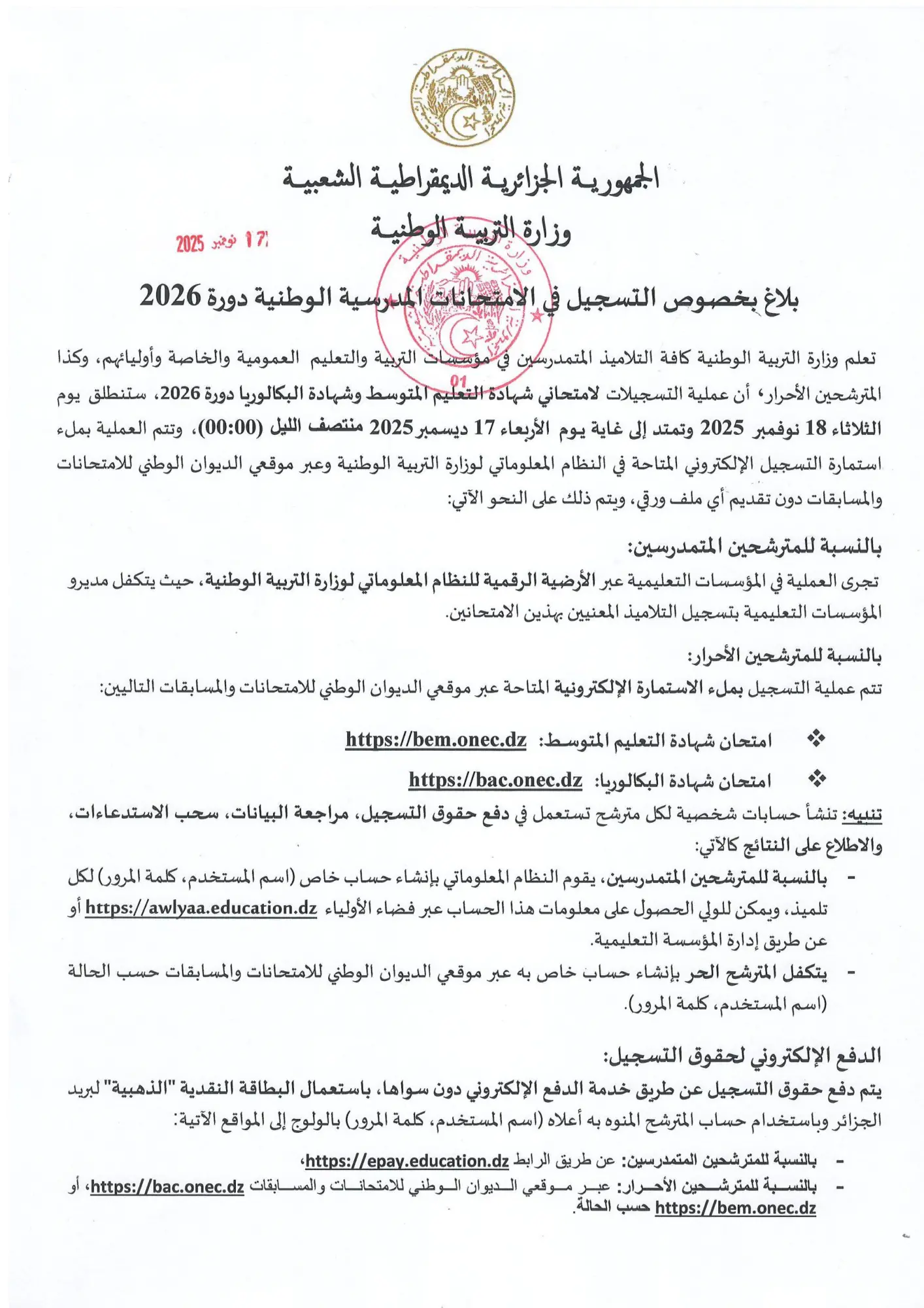 عملية تسجيل التلاميذ المعنيين بامتحانات شهادة التعليم المتوسط وكذا امتحان شهادة bac ، يتكفل بها مديرو مؤسسات التربية والتعليم العمومية والخاصة عبر أرضية وزارة التربية الوطنية.