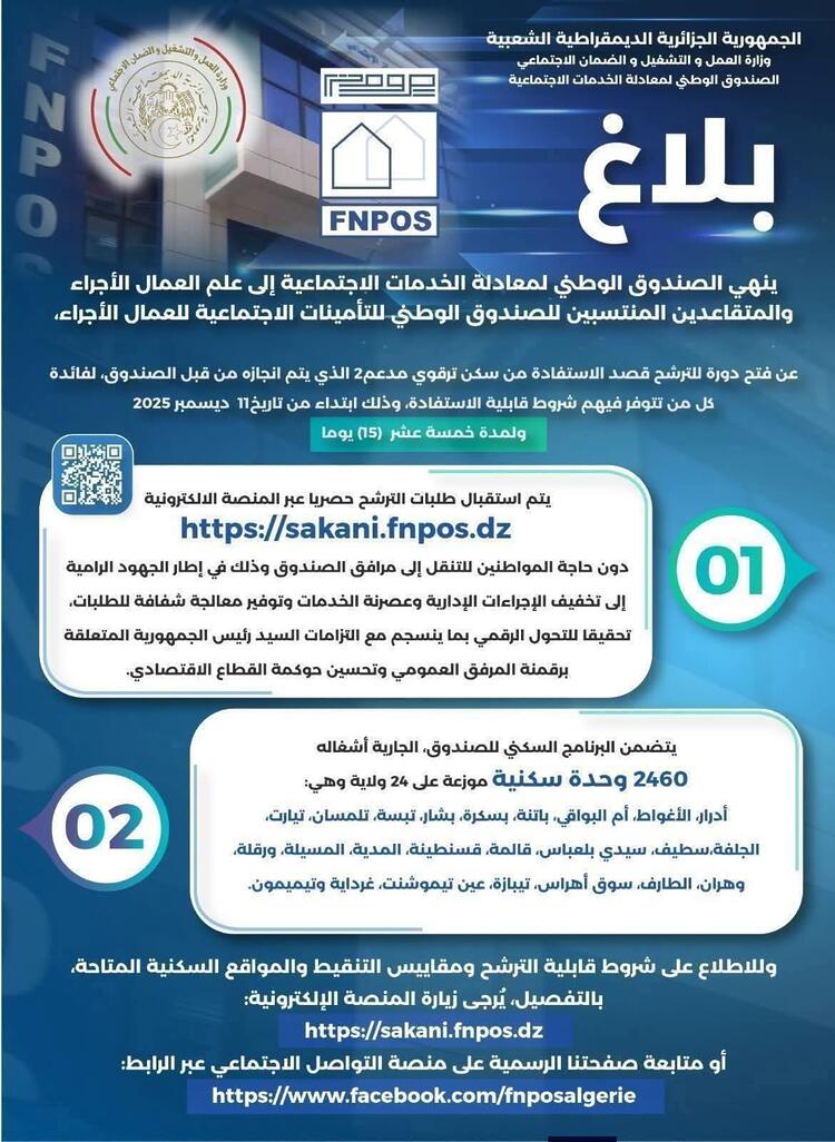 أعلن الصندوق الوطني لمعادلة الخدمات الاجتماعية (FNPOS)، اليوم الأحد، عن فتح دورة للترشّح للاستفادة من صيغة السكن الترقوي المدعم (LPA2)، الذي ينجز من طرف الصندوق لفائدة المستفيدين المستوفين لشروط الأهلية، وذلك بداية من 11 ديسمبر 2025.