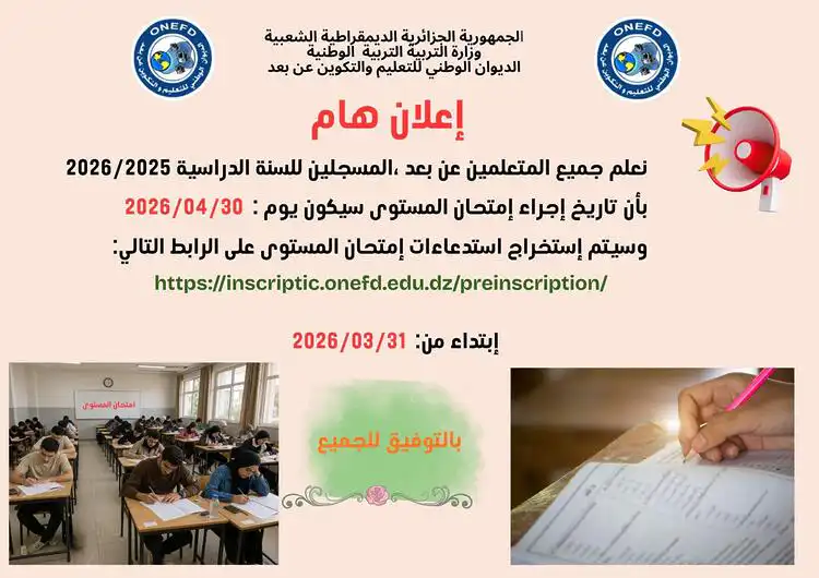 نعلم جميع المتعلمين المسجلين في الديوان الوطني للتعليم والتكوين عن بعد أن المواعيد الرسمية للامتحانات والاستدعاءات قد تحددت كالتالي: