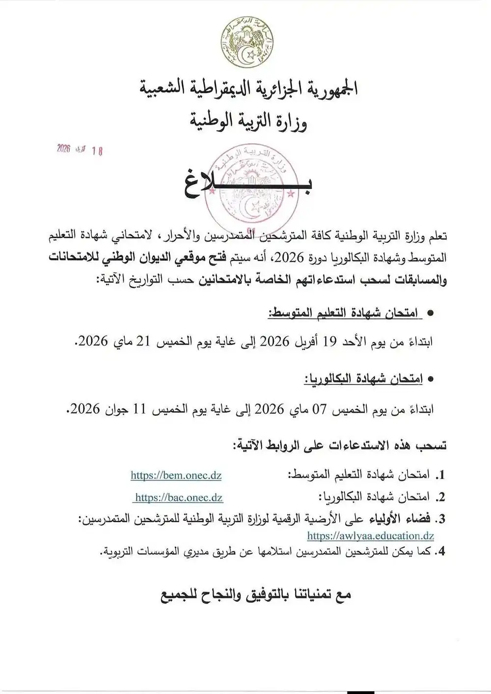 Le Ministère de l’Éducation Nationale a publié un communiqué important destiné à tous les candidats (scolarisés et libres), annonçant l’ouverture des sites officiels de l’Office National des Examens et Concours (ONEC) pour le retrait des convocations aux examens du Brevet d’Enseignement Moyen (BEM) et du Baccalauréat (BAC) pour la session de juin 2026.