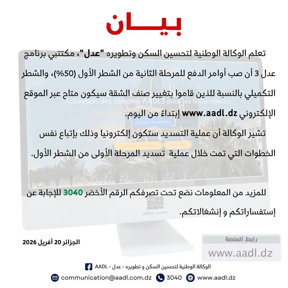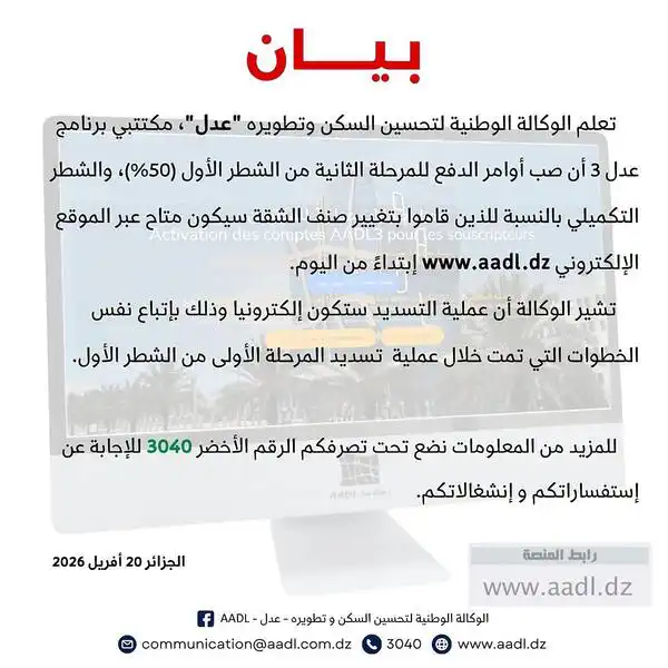 أعلنت الوكالة الوطنية لتحسين السكن وتطويره « عدل »، اليوم الإثنين 20 أفريل 2026، عن الشروع في صب أوامر الدفع للمرحلة الثانية من الشطر الأول لمكتتبي برنامج « عدل 3 » عبر الموقع الإلكتروني الرسمي للوكالة.