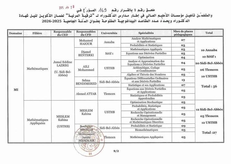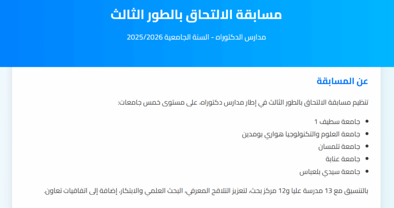 هذه المسابقة سوف تفتح في إطار مدارس الدكتوراه التي سيتم تنظيمها عبر خمس جامعات وطنية، بالتعاون مع عدد من المدارس العليا ومراكز البحث التابعة لوزارة التعليم العالي والبحث العلمي في الجزائر.