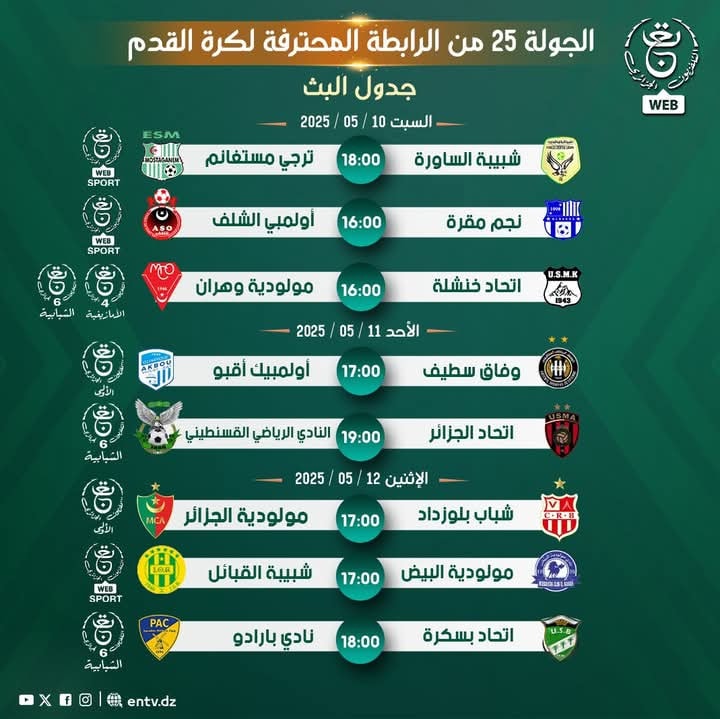 برنامج مباريات المتلفزة 📺 الجولة الـ25 للبطولة الوطنية المحترف الأول موبيليس 🇩🇿